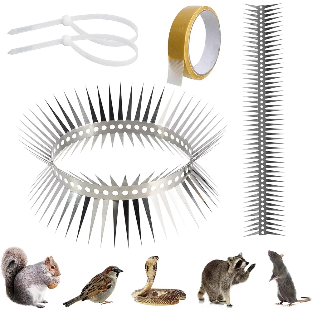 Anti Climb Spikes for more animals, such as ouse.cat, weasel, snake climbing, We used high quality.Stainless steel plate to make. lt's high toughness, can be bent and adjusted an will, easy to install. lt can be used in sewer pipe, seedling, air conditioning pipe, cable and hole fence, gas pipe and other multi site installation.
